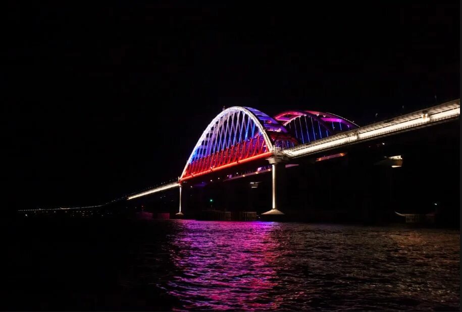 С некоторых пор у нас запрещено фотографировать из окон поездов железнодорожную инфраструктуру, да и ночью находу сделать качественное фото с помощью обычного телефона довольно сложно, поэту прийдется выложить фото красавца моста взятое из интернета: